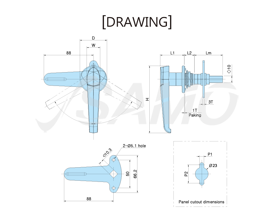 특징 : 2점 분리, 좌우겸용, 60˚ 회전각도, 스토퍼 거리조절 가능, 방수기능, 핸들과 키코어 개별작동, 내식성 우수